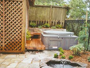 The hot tub, nestled in a corner of the yard, was surrounded by lush vegetation to create a private, spa-like atmosphere. The hot tub area is easily accessible from the main patio and includes plumbing and lighting for convenience and ambiance.